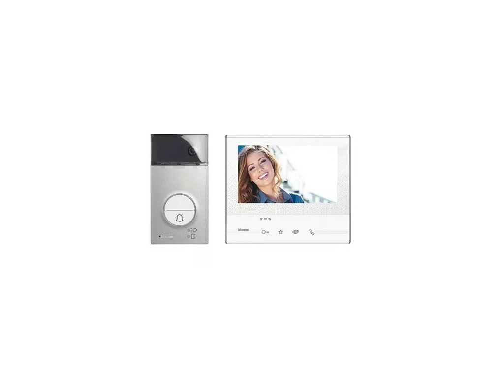 Classe 300X13E video vnútornú jednotku vo svetlej úprave s Wi-Fi, handsfree, indukčnou slučkou, so 7“ dotykovou obrazovkou s LCD displejom a záznamníkom video systému na otváranie dverí s pamäťou na audio/videohovory; LINEA 3000 panel s tlačidlami s predným krytom zo zinkovej zliatiny Zamak, so širokouhlou farebnou kamerou a bezkontaktnou čítačkou a sadou farebných elektronických kľúčeniek a dvoma elektronickými čipmi na odomykanie dverí.
