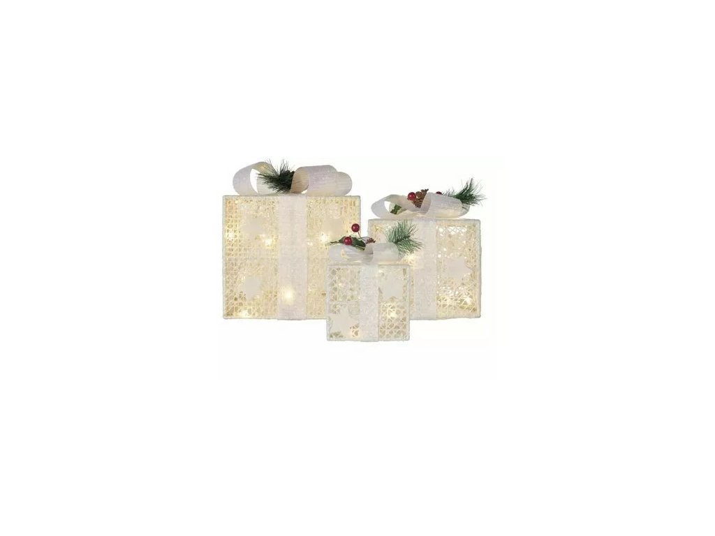 Svietiace darčeky 3 kusy. Rozmery: 20x20 + 13,5x13,5 + 11x11 cm. Biela farba,teplé biele svetlo. Vnútorné použitie.Dodatočné parametre