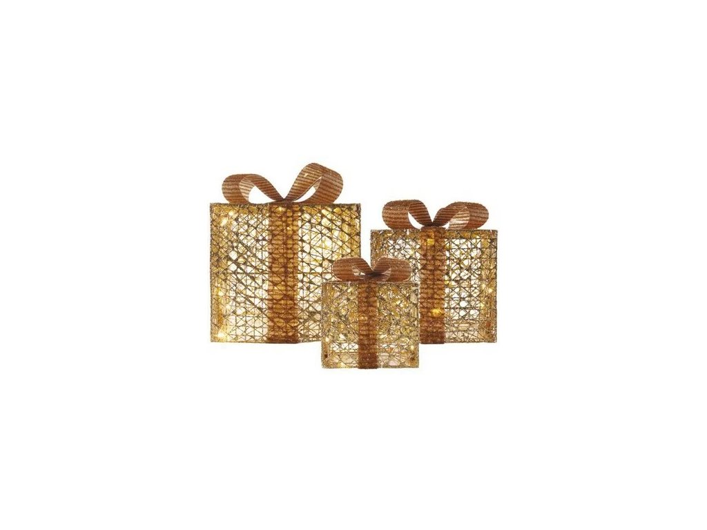 Svietiace darčeky 3 kusy. Rozmery: 25x25 + 20x20 + 15x15 cm. Zlatá farba,teplé biele svetlo. Vnútorné použitie. Kov.Dodatočné parametre