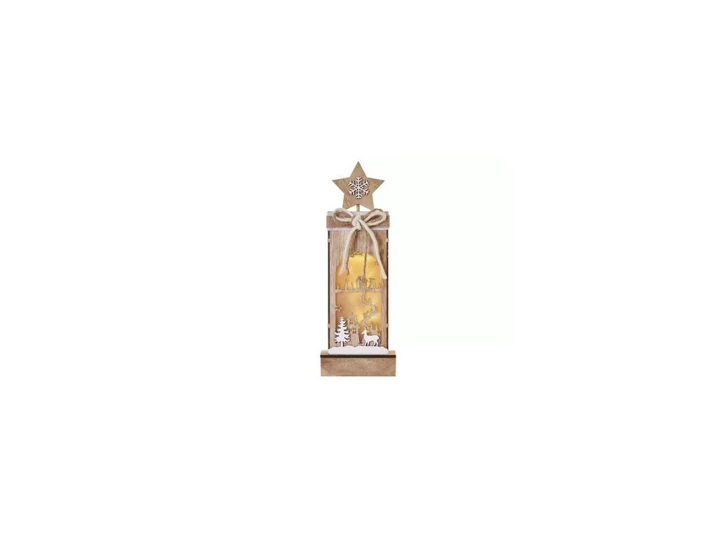 Svietiaca drevena dekorácia s tematikou dedinky. Výška 34cm. Vnútorné použitie.Na batérie 2xAA. Počet LED: 5. Teplé biele svetlo.Dodatočné parametre
