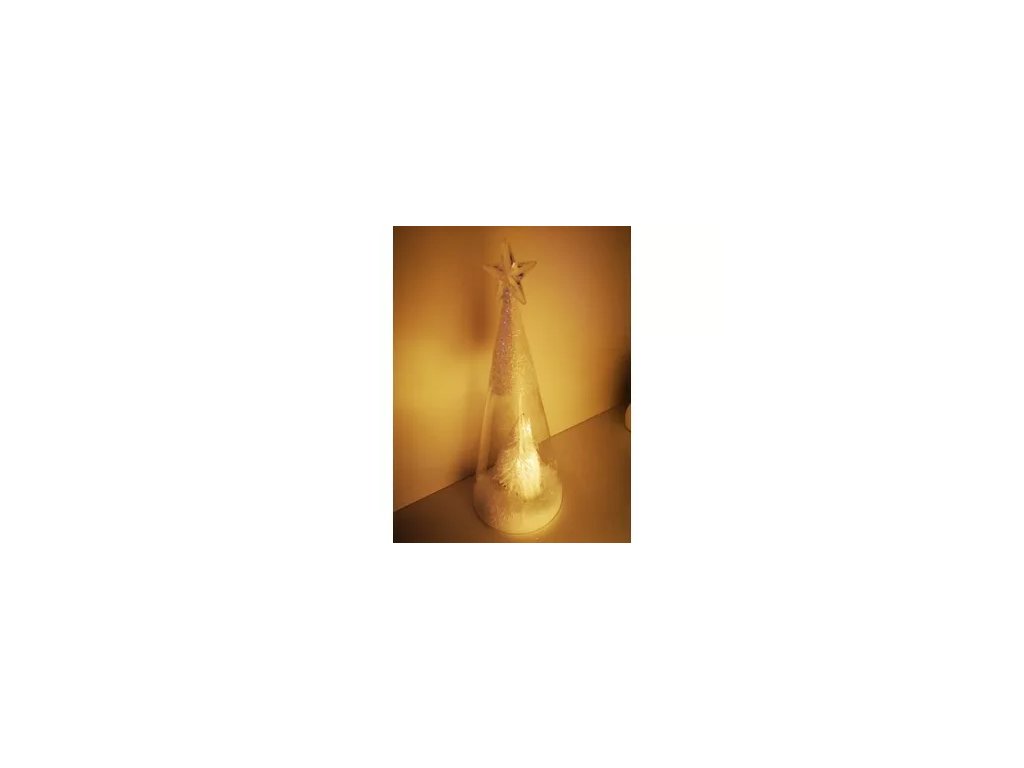 Sklenený ihlan so stromčekom vnútri. Teplé biele svetlo. Napájanie batéria2xLR44. Výška 23,5cm.Dodatočné parametre