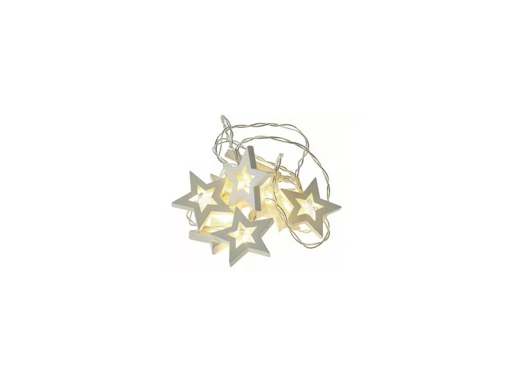 Biele drevené hviezdičky. LED retiazka na batérie 2xAA. 10 lediek - hviezdičiek.Dĺžka 1,35m. Vnútorné použitie. Teplé biele svetlo.Dodatočné parametre