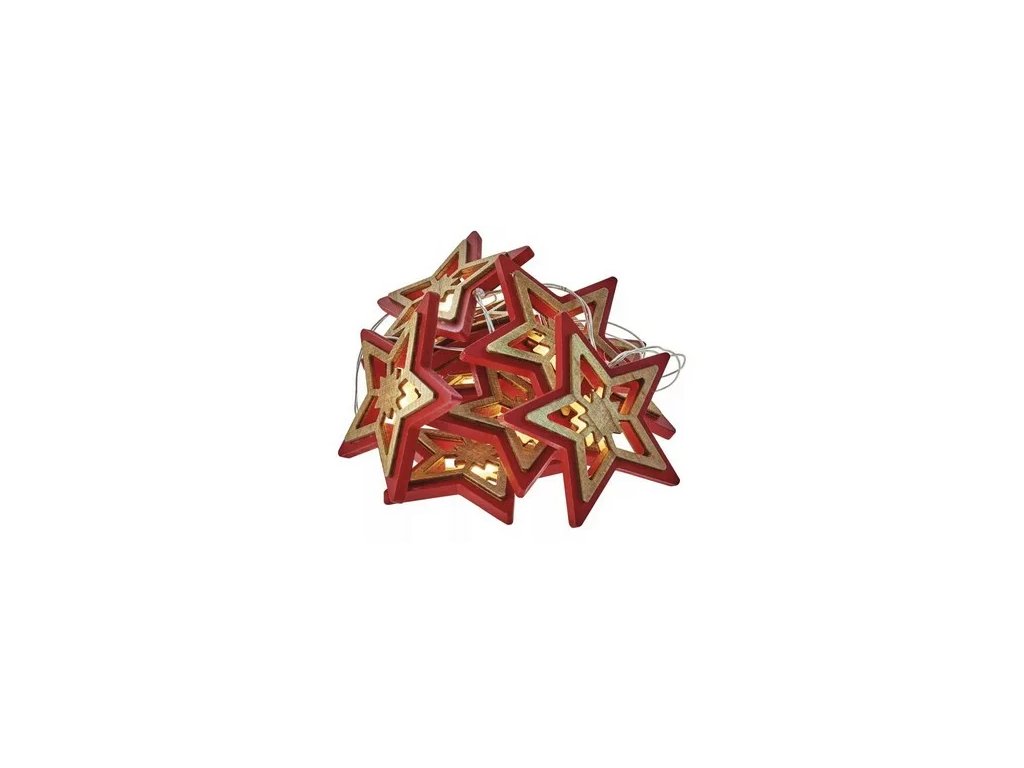 Svetelná reťaz s drevenými červeno-zlatými hviezdami. Dĺžka 1,35 metra. Nabatérie 2xAA. Teplé biele svetlo. Vnútorné použitie.Dodatočné parametre