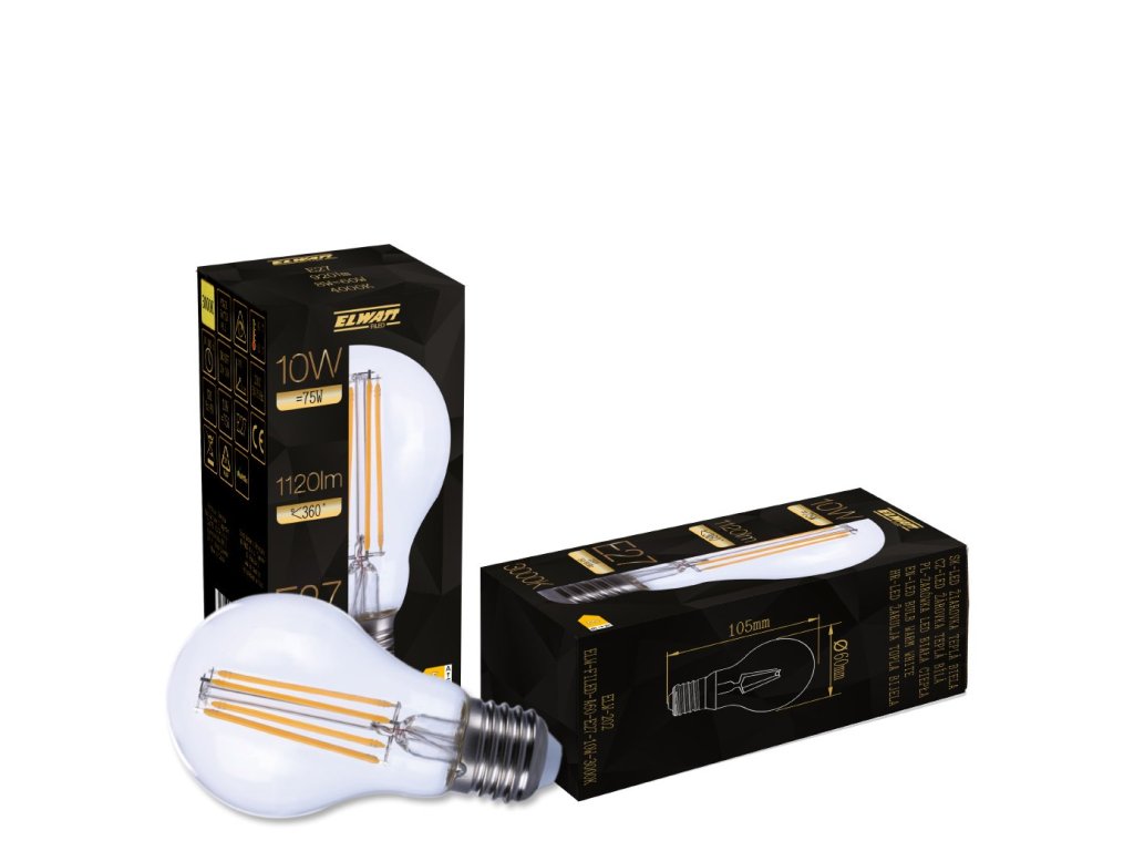 LED žiarovka FILAMENT - A60 E27 10W/3000K - 1120lm - ELWATT - ELW-202 • LED žiarovka FILAMENT • Pätica: E27 • Príkon: 10W • Ekvivalent: 10W=75W • Farba svetla: 3000K/ teplá biela • Svetelný tok: 1120lm • Tvar svetelného zdroja: A60 • Aplikované napätie: 230V, 50Hz • IP ochrana: IP20 • Rozmer: 105mm x 60mm • Životnosť: 30 000h • On/off: 20 000Dodatočné parametre