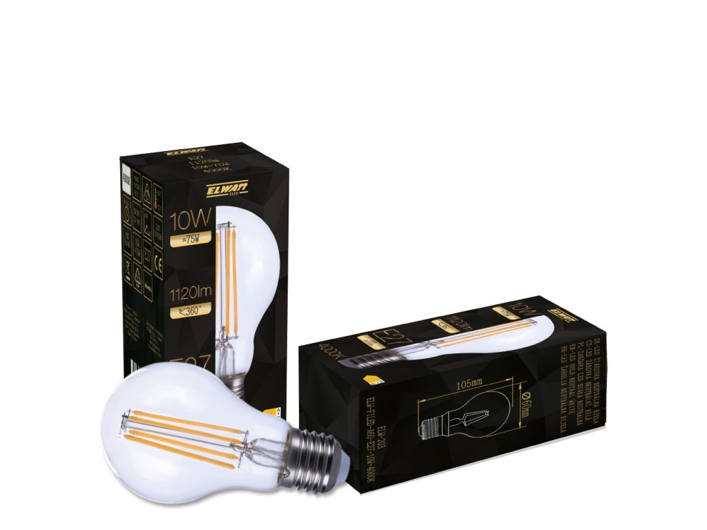 LED žiarovka FILAMENT - A60 E27 10W/4000K - 1120lm - ELWATT - ELW-203 • LED žiarovka FILAMENT • Pätica: E27 • Príkon: 10W • Ekvivalent: 10W=75W • Farba svetla: 4000K/ neutrálna biela • Svetelný tok: 1120lm • Tvar svetelného zdroja: A60 • Aplikované napätie: 230V, 50Hz • IP ochrana: IP20 • Rozmer: 105mm x 60mm • Životnosť: 30 000h • On/off: 20 000Dodatočné parametre