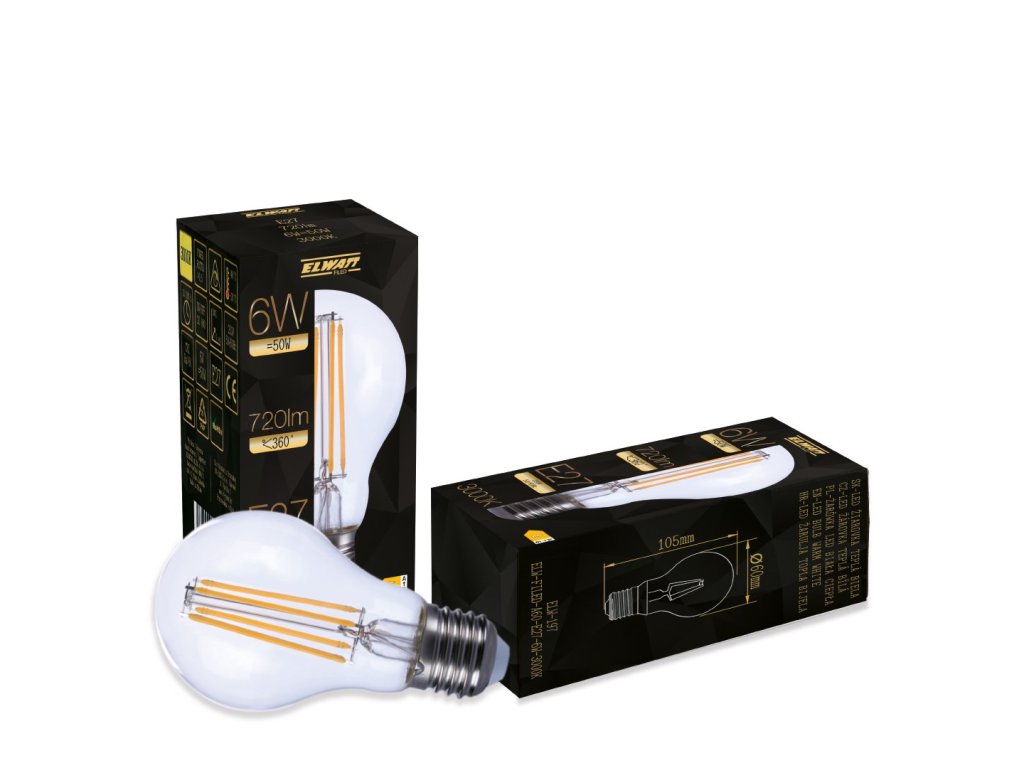 LED žiarovka FILAMENT - A60 E27 6W/3000K - 720lm - ELWATT - ELW-197 • LED žiarovka FILAMENT • Pätica: E27 • Príkon: 6W • Ekvivalent: 6W=50W • Farba svetla: 3000K/ teplá biela • Svetelný tok: 720lm • Tvar svetelného zdroja: A60 • Aplikované napätie: 230V, 50Hz • IP ochrana: IP20 • Rozmer: 105mm x 60mm • Životnosť: 30 000h • On/off: 20 000Dodatočné parametre
