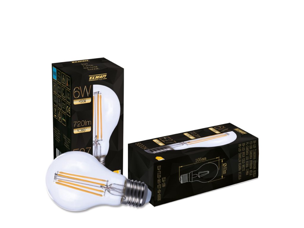 LED žiarovka FILAMENT - A60 E27 6W/6000K - 720lm - ELWATT - ELW-199 • LED žiarovka FILAMENT • Pätica: E27 • Príkon: 6W • Ekvivalent: 6W=50W • Farba svetla: 6000K/ studená biela • Svetelný tok: 720lm • Tvar svetelného zdroja: A60 • Aplikované napätie: 230V, 50Hz • IP ochrana: IP20 • Rozmer: 105mm x 60mm • Životnosť: 30 000h • On/off: 20 000Dodatočné parametre