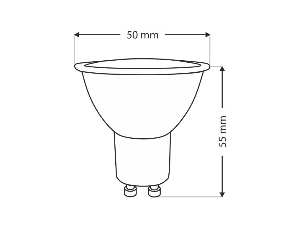 Úsporná LED žiarovka Trixline s päticou GU10, šetrná k životnému prostrediu, neobsahuje žiadnu ortuť ani olovo, navyše sa dobre osvedčuje aj pri extrémne nízkych aj vysokých teplotách, kedy s vláknovými žiarovkami bývajú problémy. Jej životnosť dosahuje až 30 000 hodín. Vďaka svojmu výkonu 10W výborne poslúži ako náhrada za klasickú 70W žiarovku. LED žiarovka sa po zapnutí okamžite rozsvieti bez akéhokoľvek oneskorenia a vyžaruje príjemné neutrálne biele svetlo 4200K. Vlastnosti: Životnosť: 30 000 hod. (30 000 on/off) Náhrada za 70W žiarovku Šetrí 85% energie Uhol vyžarovania: 120° Napätie: 220-240V, 50/60Hz 90mA Materiál: Plast Rozmer žiarovky (ŠxV): ø50x55mm Balenie: 1/10/100 Rozmer balenia 1ks (ŠxVxH): 52x60x52mm Váha balenia 1ks: 36g EAN dislay 10ks: 8595159881225 Váha dislay: 360g Rozmery (ŠxVxH): 265x121x53mm EAN kartónu 100ks: 8595159881232 Váha GW kartón: 3,2kg (3200g) Váha NW kartón: 2,0kg (2000g) Rozmery (ŠxVxH): 550x140x280mmDodatočné parametre