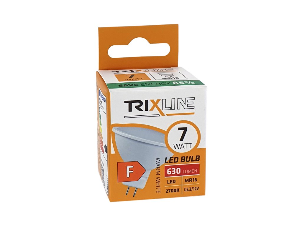 LED žiarovka s päticou MR16 s výkonom 7W (náhrada za klasickú 51W žiarovku). Poskytuje teplé biele svetlo 2700K. Použité moderné technológie a materiály zaručujú dlhú životnosť až 30.000 hodín. Pri zapnutí je okamžite k dispozícii plný svetelný výkon žiarovky bez jej zahrievania. Energetická trieda F Pätica MR16 Príkon (W) 7 Napájacie napätie (V) 12 Stmievateľná Nie Životnosť 30 000 h Svetelný tok (lm) 630 Teplota svetla (K) 2700 Farba svetla Teplá biela Uhol svietenia (°) 120 Výška produktu 55 mm Priemer produktu 55 mm Náhrada za žiarovku 51 - 60 W Tvar G5,3 Svetelná účinnosť 61 - 90 lm/W Značka TrixlineDodatočné parametre