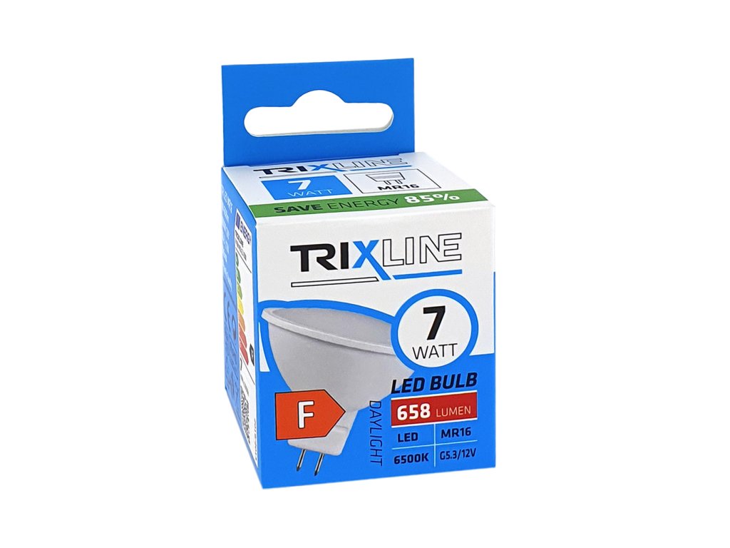 Energetická trieda F Pätica MR16 Príkon (W) 7 Napájacie napätie (V) 12 Stmievateľná Nie Životnosť 30 000 h Svetelný tok (lm) 658 Teplota svetla (K) 6500 Farba svetla Studená biela Uhol svietenia (°) 120 Výška produktu 55 mm Priemer produktu 55 mm Svetelná účinnosť 91- 120 lm/W Značka TrixlineDodatočné parametre