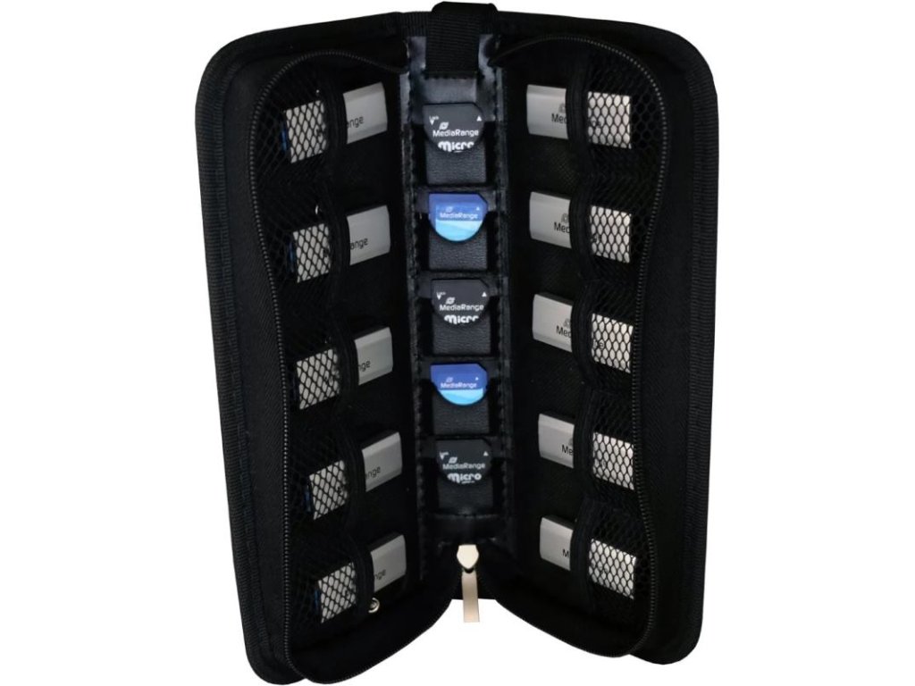 Praktické usporiadanie: 10 samostatných sieťovaných vreciek pre USB a 5 jednotlivých slotov pre SD karty