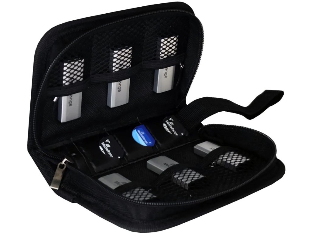 Praktické rozdelenie: 6 samostatných sieťovaných vreciek pre USB flash disky a 3 jednotlivé sloty pre SD karty