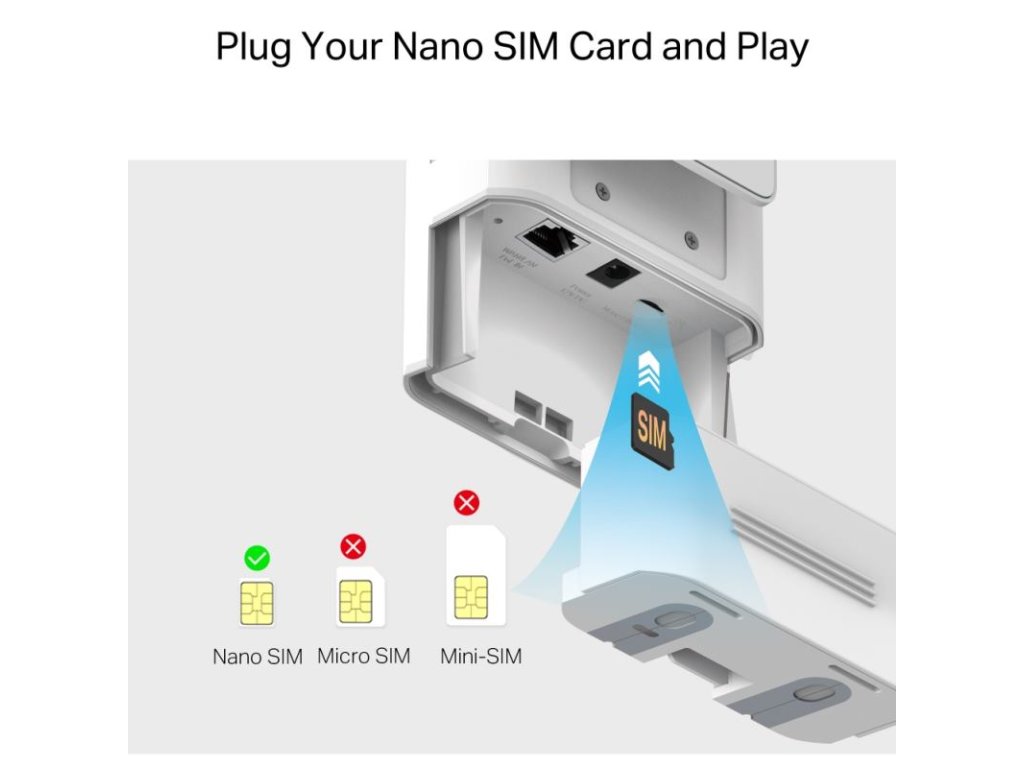 Rozhrania: 1× 10/100 Mbps LAN port (s PoE vstupom), 1× slot na Nano SIM kartu, 1× DC port pre napájanie.