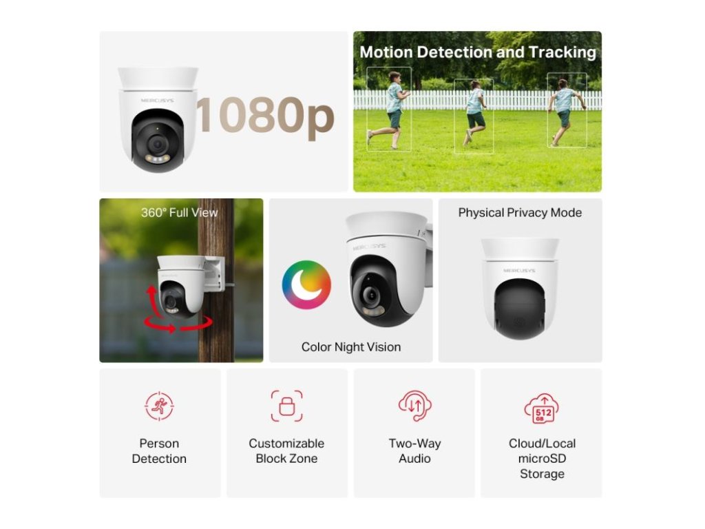 MC500 Outdoor Pan/Tilt Security Wi-Fi Camera je inteligentná kamera navrhnutá na zabezpečenie vonkajších priestorov. Ponúka široký rozsah funkcií pre ochranu vášho majetku s detailným obrazom a početnými možnosťami pripojenia.