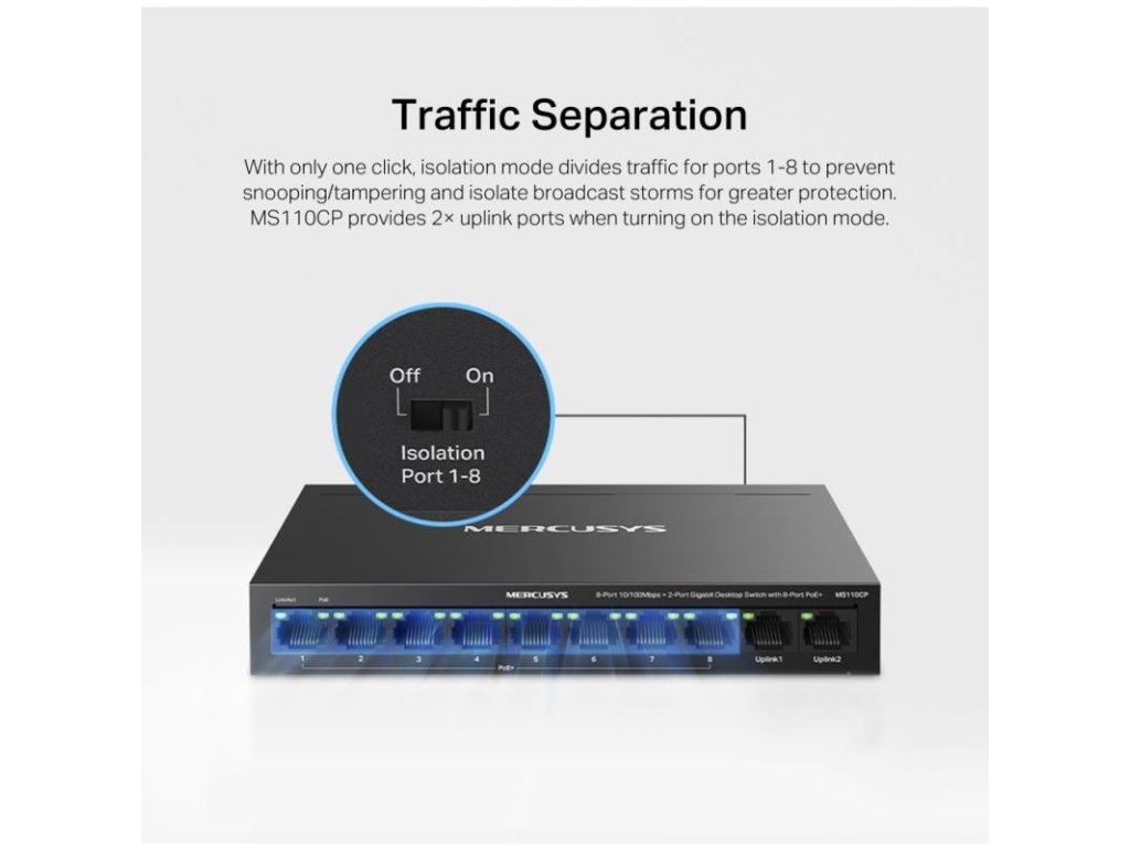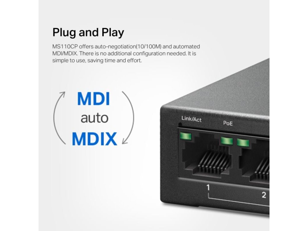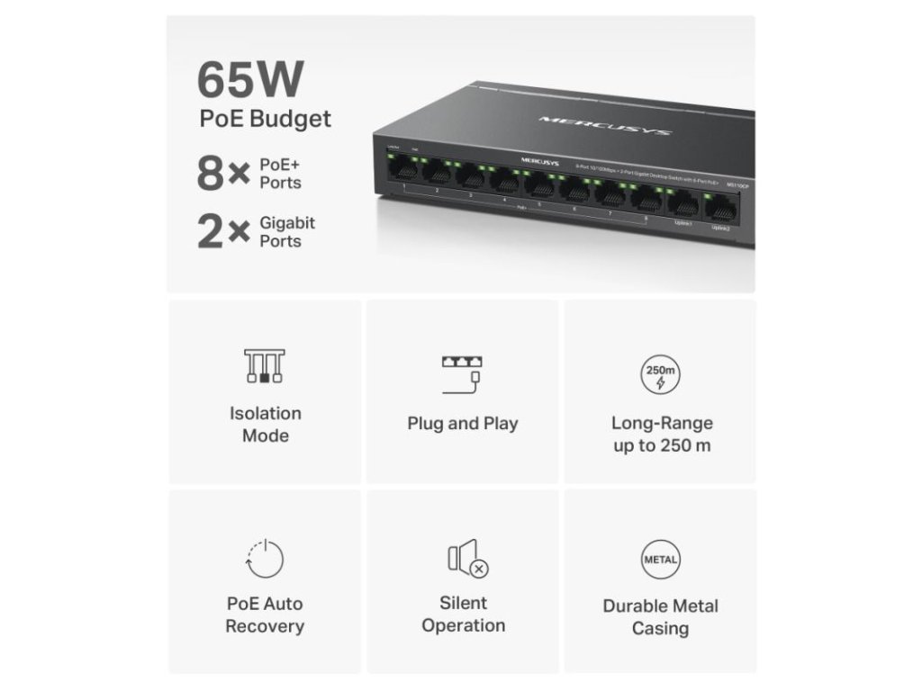 Switch MS110CP je 8-portový desktopový switch s rýchlosťou 10/100 Mbps a 2 gigabitovými portami, vybavený 8 PoE+ portami, ideálny pre malé a stredné podniky využívajúce IP dohľad s celkovým rozpočtom na PoE 65 W. Jeho jednoduchý dizajn "plug-and-play" zaručuje rýchlu a bezproblémovú inštaláciu bez potreby technika.