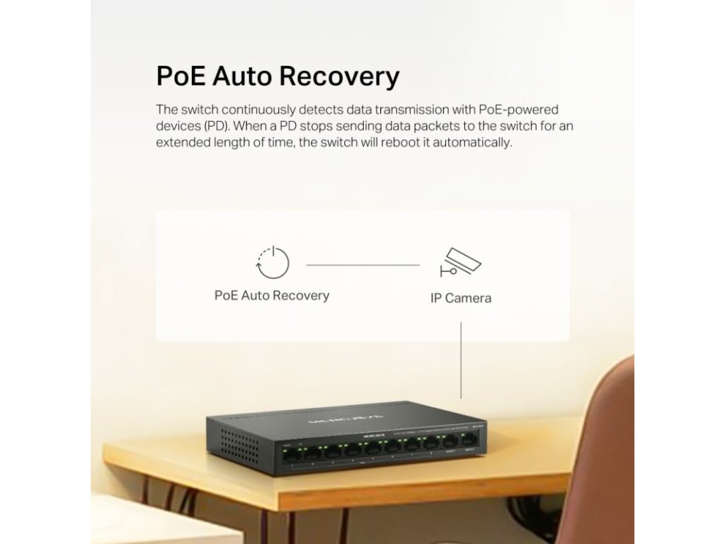 10 portov: 8 × 10/100 Mbps PoE+ porty a 2 × Gigabit non-PoE porty