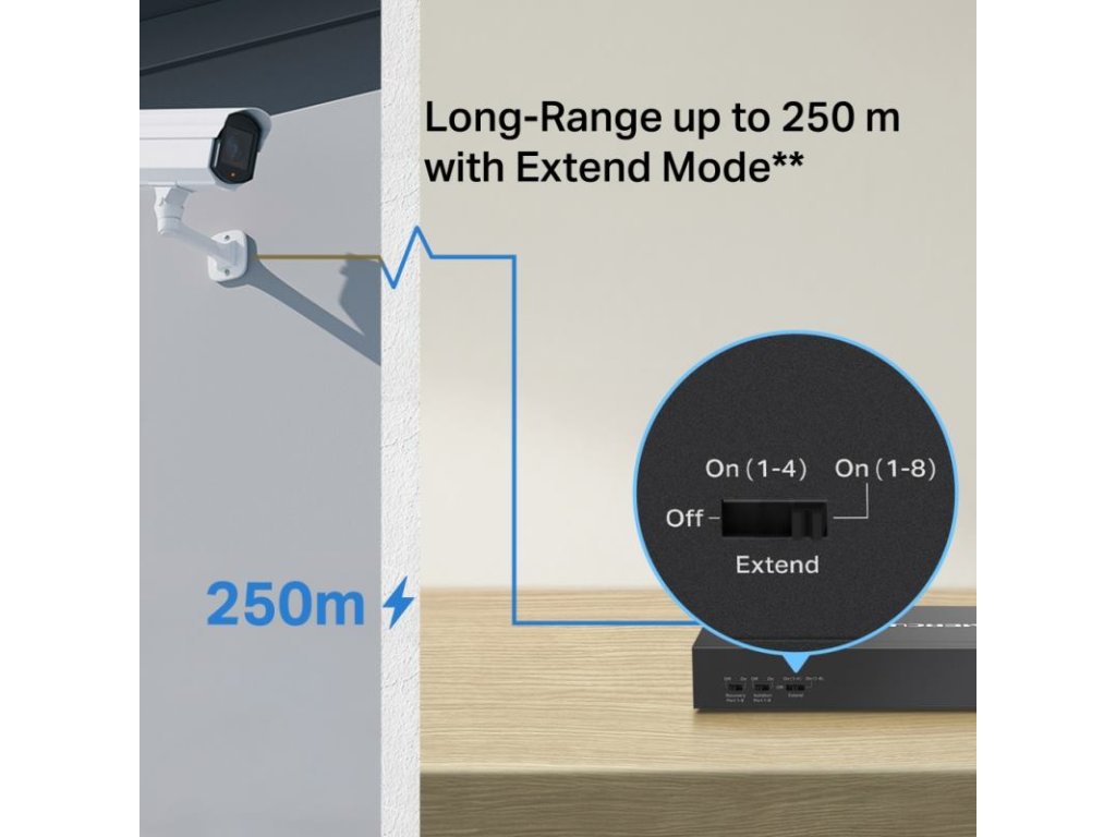 Dlhý dosah prenosu: V režime Extend môže prenášať PoE až na vzdialenosť 250 m