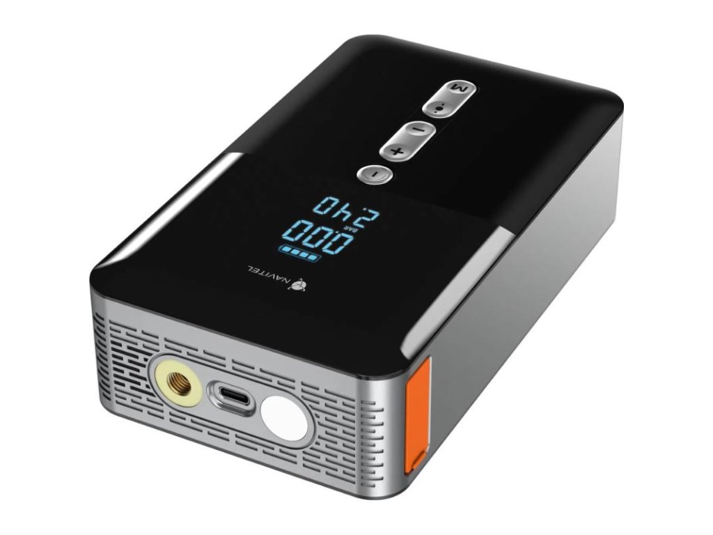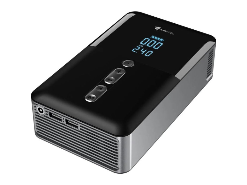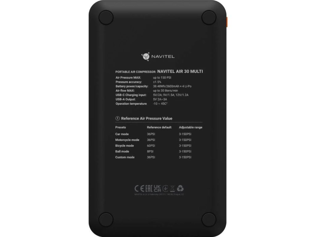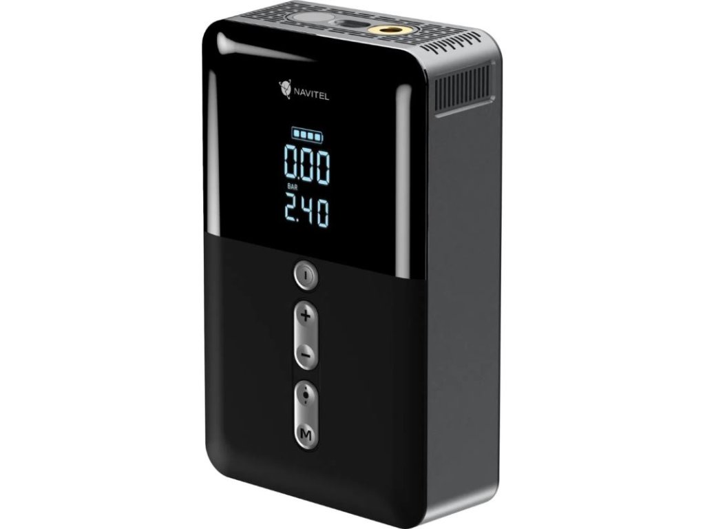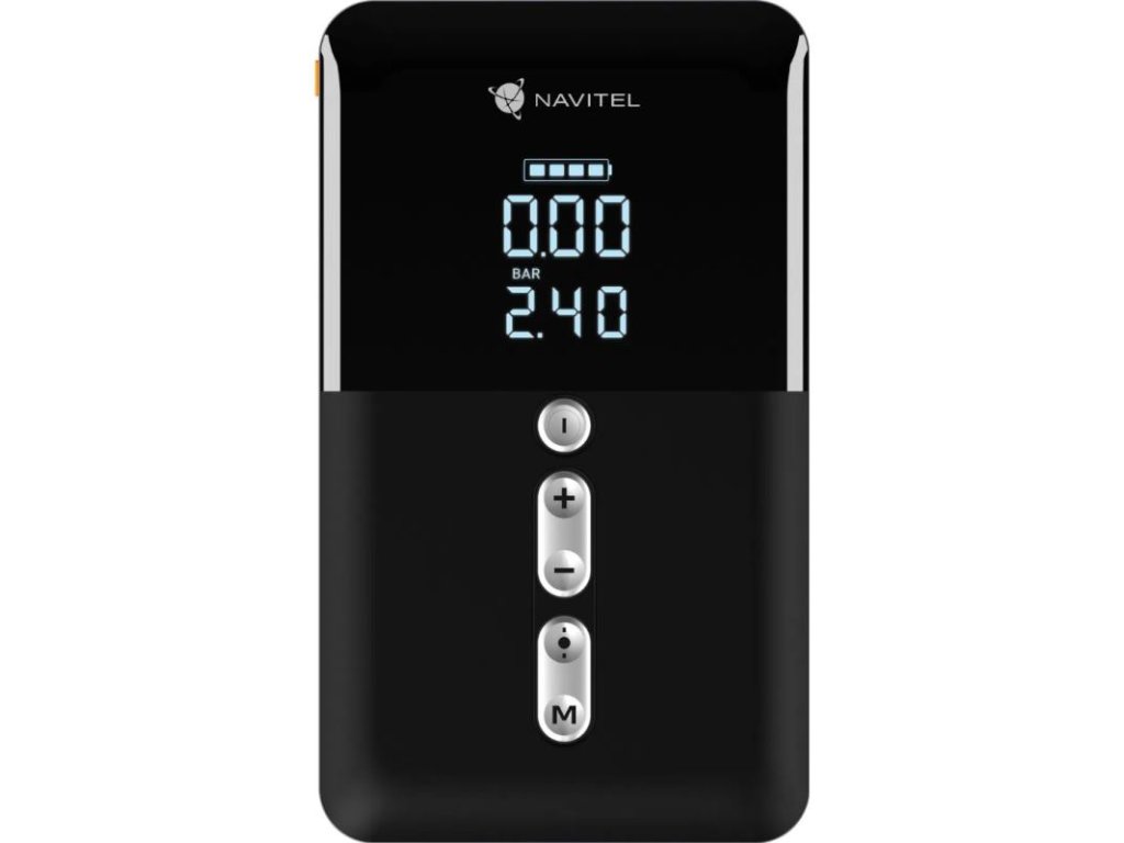 Na kompresore NAVITEL je umiestnený LCD displej zaisťujúci presné nastavenie a čítanie všetkých hodnôt. Uvidíte na ňom aktuálny tlak, jednotky merania a stav batérie. Všetky funkcie kompresora NAVITEL AIR 30 MULTI sa ovládajú pomocou piatich tlačidiel na prednom paneli. Vo výbave zariadenia nechýbajú dva USB-A výstupy (5 V/2 A) umožňujúce nabíjanie drobnej elektroniky, ako súsmartfóny, tablety, slúchadlá a ďalšie. Kompresor NAVITEL poháňa 10 000 mAh batéria, ale je možné ho zapojiť do 12 V autozásuvky cez USB-C kábel.