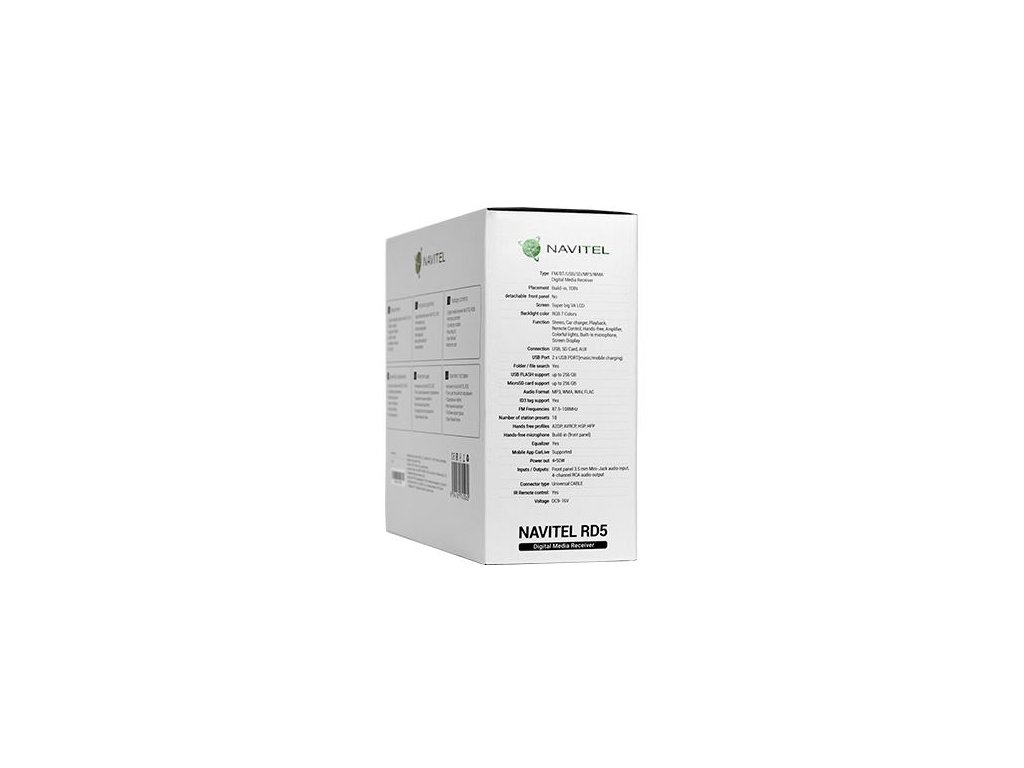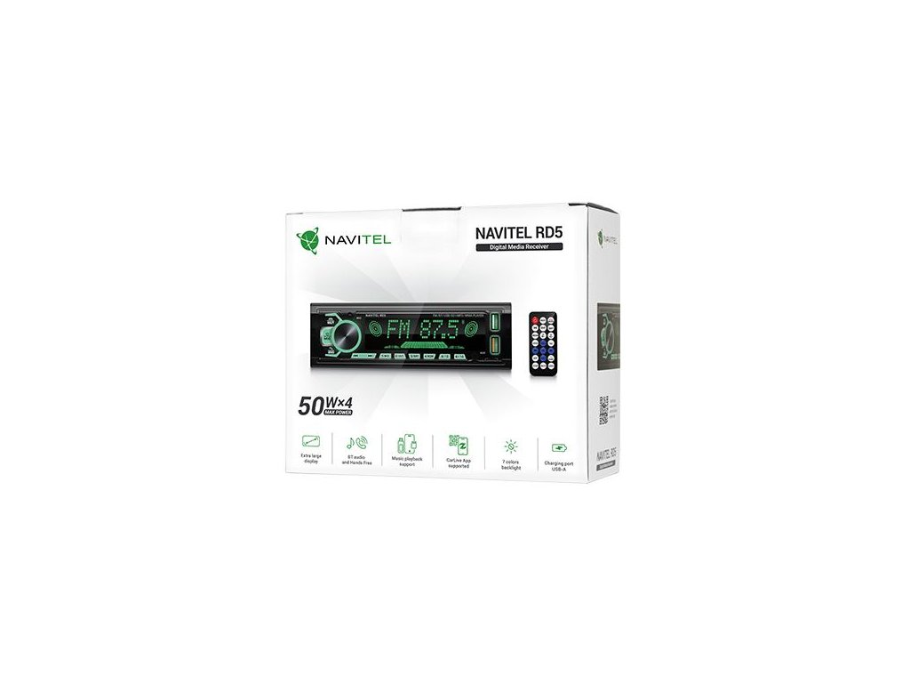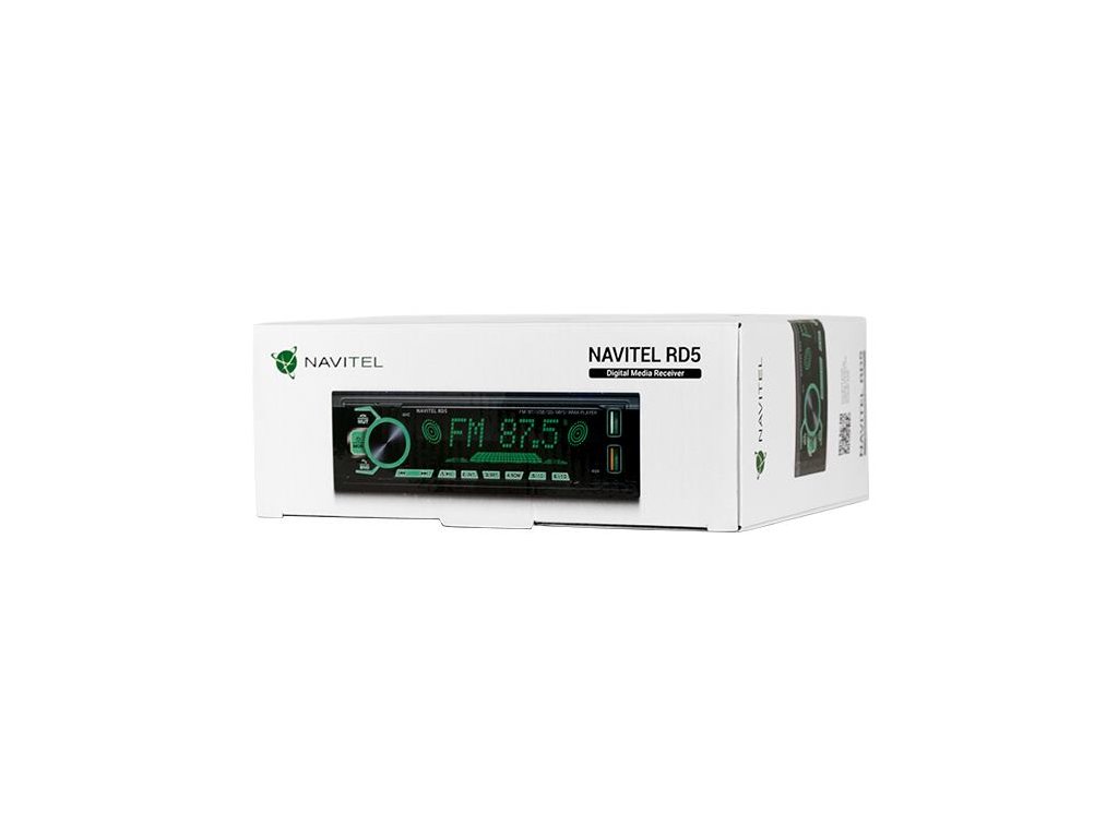 NAVITEL RD5 je multifunkčné autorádio v štandardnej veľkosti 1DIN. Radio je vybavené digitálnym FM modulom s rozsahom príjmu FM 87,5-108 MHz, do pamäte je možné uložiť 18 staníc, ktoré možno ľahko prepínať pomocou tlačidiel na prednom paneli. Zariadenie poskytuje ovládanie basov a výšok, rovnako ako niekoľko prednastavených nastavení ekvalizéra. Vďaka RCA výstupom môžete k zariadeniu pripojiť aj externý zosilňovač.