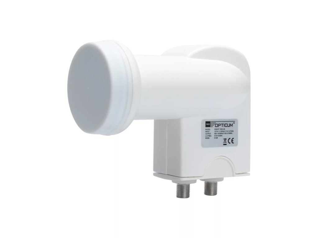 Univerzálny LNB twin konvertor Opticum je vhodný pre 2 satelitné prijímače ktorý je analógové alebo digitálny príjem s nízkym šumový číslom 0,1 dB.