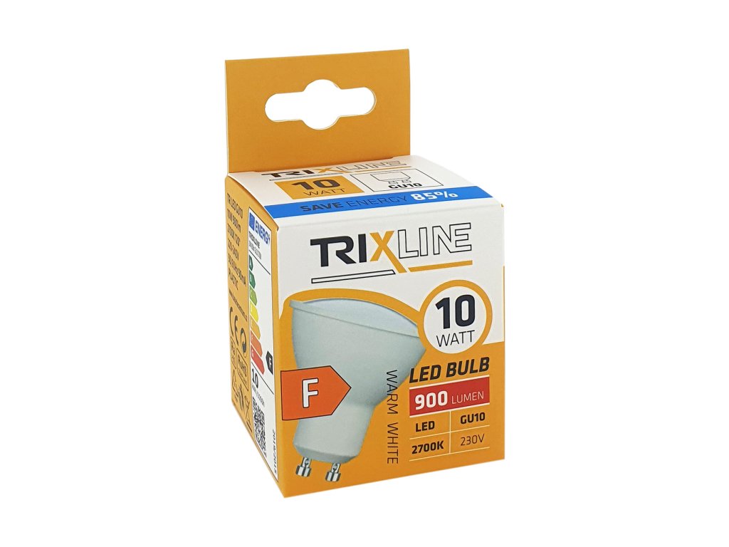 Úsporná LED žiarovka Trixline s päticou GU10, šetrná k životnému prostrediu, neobsahuje žiadnu ortuť ani olovo, navyše sa dobre osvedčuje aj pri extrémne nízkych aj vysokých teplotách, kedy s vláknovými žiarovkami bývajú problémy. Jej životnosť dosahuje až 30 000 hodín. Vďaka svojmu výkonu 10W výborne poslúži ako náhrada za klasickú 70W žiarovku. LED žiarovka sa po zapnutí okamžite rozsvieti bez akéhokoľvek oneskorenia a vyžaruje príjemné teplé biele svetlo 2700K. Vlastnosti: Životnosť: 30 000 hod. (30 000 on/off) Náhrada za 70W žiarovku Šetrí 85% energie Uhol vyžarovania: 120° Napätie: 220-240V, 50/60Hz 90mA Materiál: Plast Rozmer žiarovky (ŠxV): ø50x55mm Balenie: 1/10/100 Rozmer balenia 1ks (ŠxVxH): 52x60x52mm Váha balenia 1ks: 35g EAN dislay 10ks: 8595159881195 Váha dislay: 358g Rozmery (ŠxVxH): 264x122x53mm EAN kartónu 100ks: 8595159881201 Váha GW kartón: 3,2kg (3200g) Váha NW kartón: 2,0kg (2000g) Rozmery (ŠxVxH): 550x140x280mmDodatočné parametre