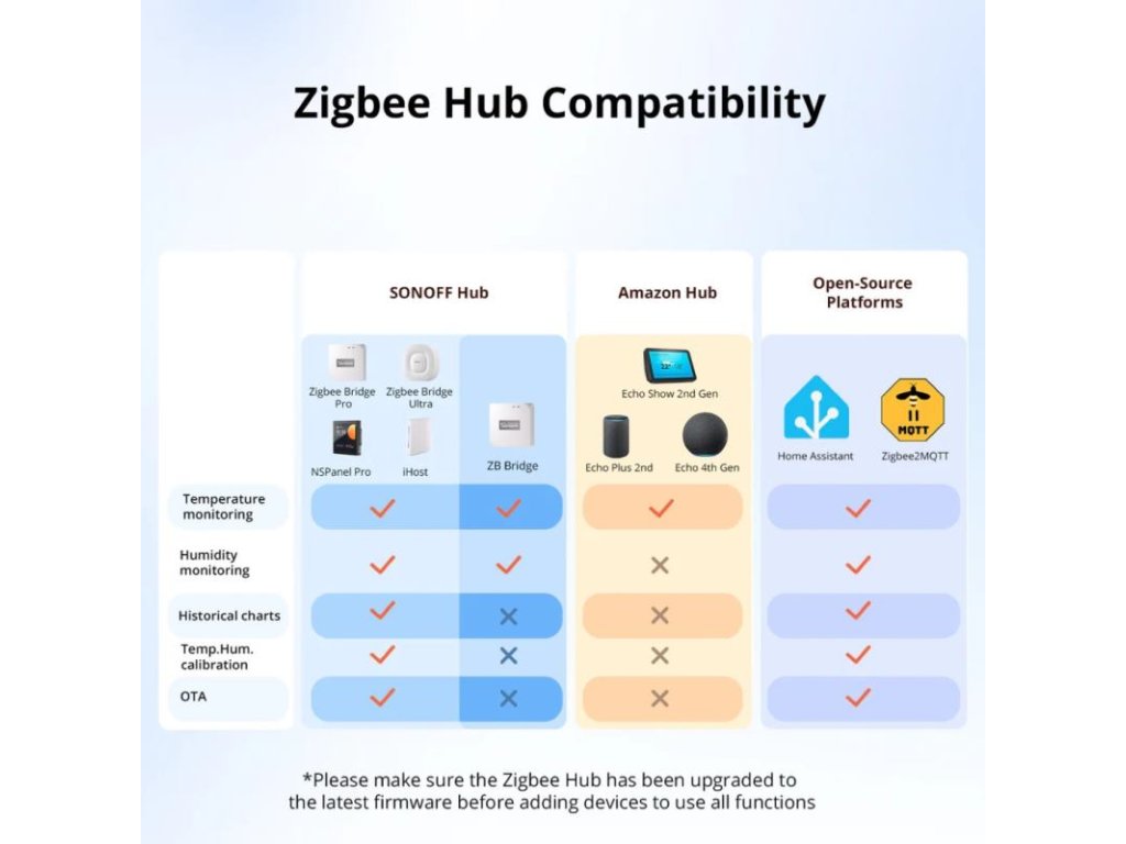 Kompatibilita s bránami a asistentmi: kompatibilný s väčšinou Zigbee 3.0 brán (napr. SONOFF Zigbee Bridge Pro, SONOFF NSPanel Pro, ZBDongle-P/E, Alexa so zabudovaným Zigbee Hubom). Funguje so Alexou a Google Home.