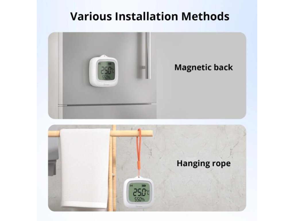 SNZB-02WD je inteligentný senzor teploty a vlhkosti s LCD displejom, ktorý využíva Zigbee 3.0. Je určený na diaľkové monitorovanie podmienok v miestnosti a na automatické prepínanie iných Zigbee zariadení (a pri použití so Zigbee bránou aj WiFi zariadení) na základe nameraných údajov. Dáta sú dostupné aj lokálne na LCD displeji.