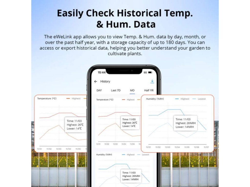 Mobilný a lokálny monitoring: meranie v reálnom čase, synchronizácia s mobilnou aplikáciou, alebo zobrazenie na LCD displeji; môžete zobraziť historické údaje po hodínach alebo dňoch a exportovať dáta.
