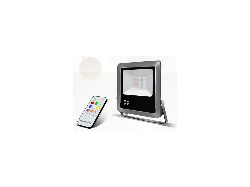 LED reflektor s farebným svetlom RGB - červená-zelená-modrá, stmievateľný, sdiaľkovým ovládaním. Watáž: SMD LED 20W, 1600lm, RGB, IP65.Dodatočné parametre