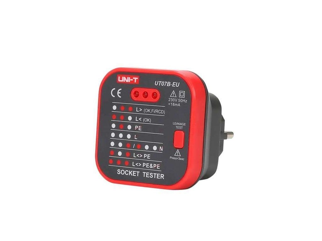 Prístroj UNI-T UT07B-EU je tester pre jednoduchú kontrolu zapojenia zásuviek 230V/AC. Pomocou troch kontrolných diód LED signalizuje správne pripojenie všetkých troch vodičov rozvodu a funkčnosť zapojenia prúdového chrániča.