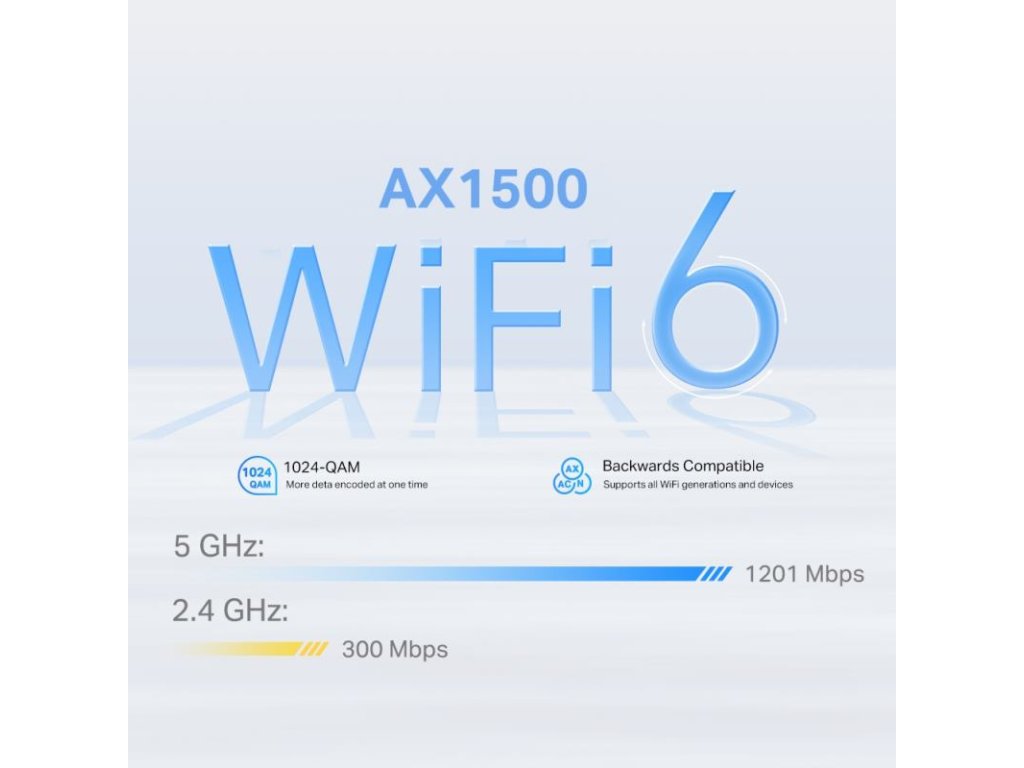 AX1500: 5 GHz: 1201 Mbps (802.11ax), 2,4 GHz: 300 Mbps (802.11n)