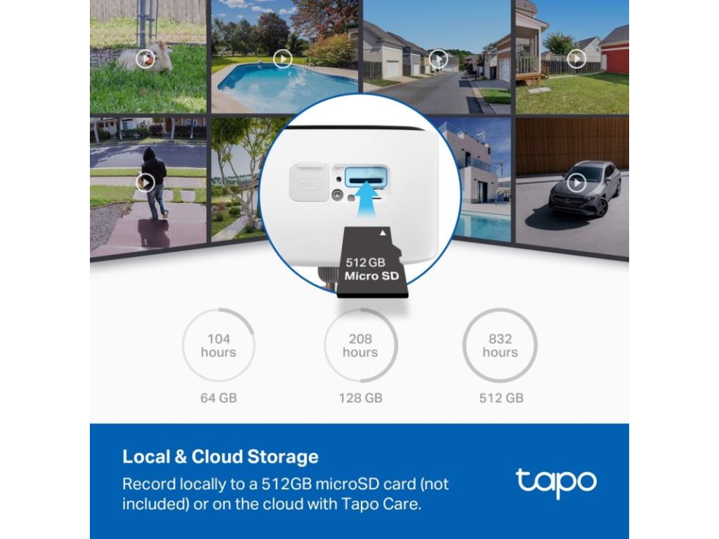 Miesta na ukladanie a cloud: Nahrávanie môže prebiehať na lokálnu microSD kartu s kapacitou až 512 GB (nie je súčasťou balenia) alebo si môžete predplatiť Tapo Care pre 30-dňové cloudové úložisko.