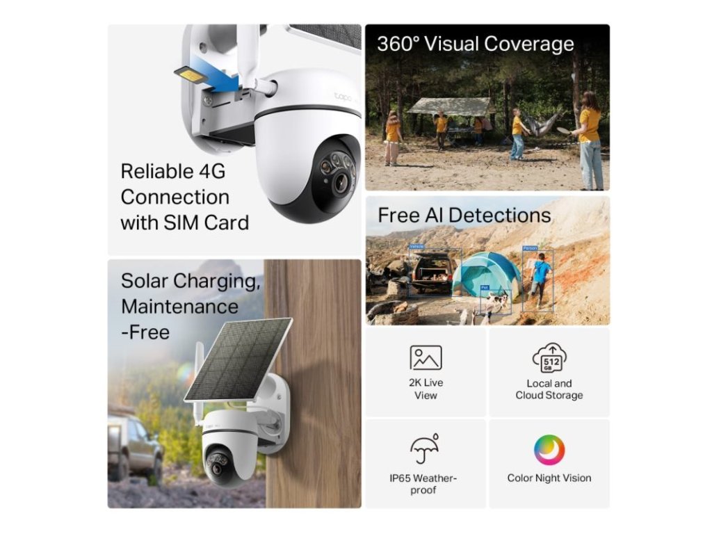 Tapo C615G je solárne napájaná bezpečnostná kamera s 4G LTE pripojením, navrhnutá pre bezdrôtové monitorovanie vašich priestorov na miestach, kde nie je k dispozícii stabilné Wi-Fi pripojenie. Tento inovatívny produkt ponúka množstvo výhod a funkcií, ktoré zabezpečujú efektívne a pohodlné sledovanie.