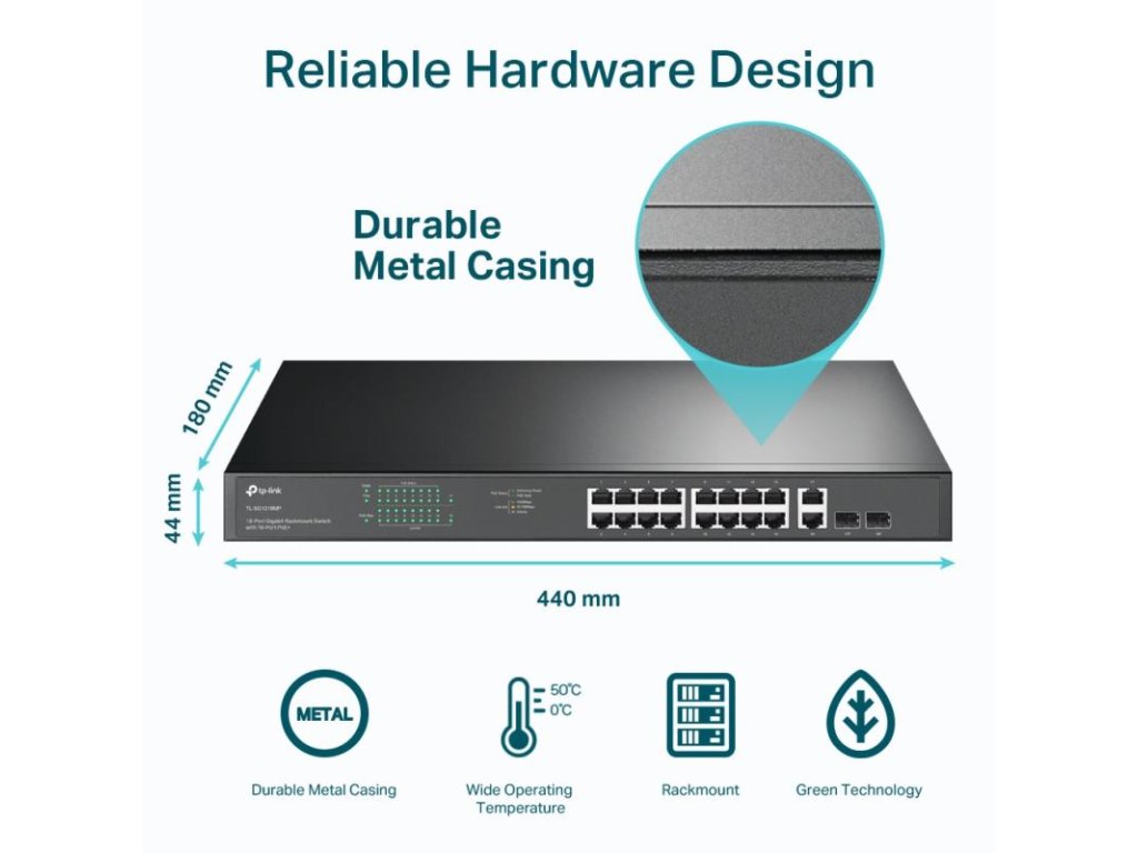 Switch TP-Link TL-SG1218MP sa pýši odolným kovovým puzdrom s dizajnom na prvotriedny odvod tepla. Vďaka tomu sa prevádzková teplota môže pohybovať v rozmedzí (0 ? 50 stupňov).