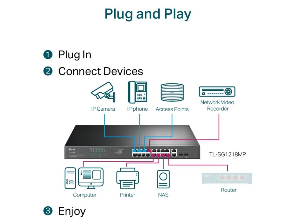 Switch TP-Link TL-SG1218MP stačí jednoducho zapojiť k napájaniu a pripojiť požadované zariadenie. To všetko zvládnete sami bez odbornej asistencie a behom chvíle budete mať vaše pripojené zariadenia sprevádzkované a s prístupom k internetu.
