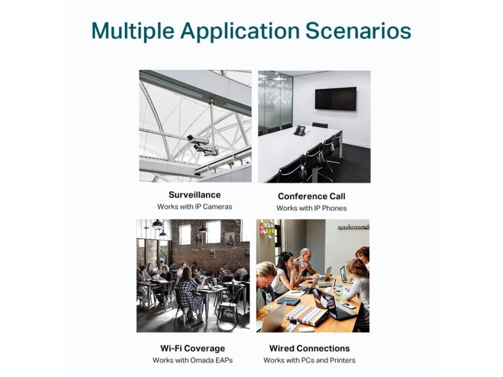 Switch TP-Link TL-SG1218MP je plne kompatibilný so zariadeniami PoE, medzi ktoré sa radia napríklad IP kamery, IP telefóny alebo prístupové body. Switch samozrejme funguje aj so zariadeniami, ktoré PoE nepodporujú, tým ale poskytne gigabitové pripojenie (tlačiarne, počítače IPTV a pod.).