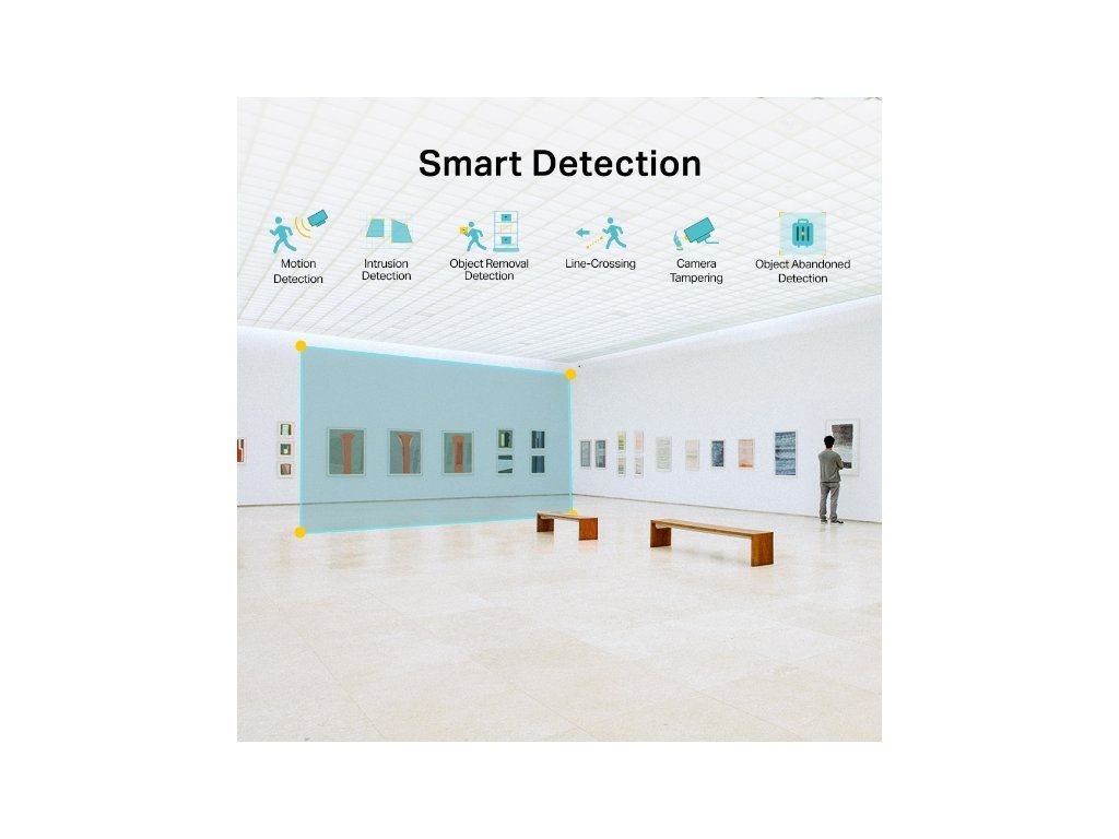 Inteligentná detekcia: Prijímajte oznámenia a kontrolujte kanály, keď niekto prekročí hranicu, vstúpi do nastavenej oblasti, prekáža kamere alebo odstráni/opustí objekty.