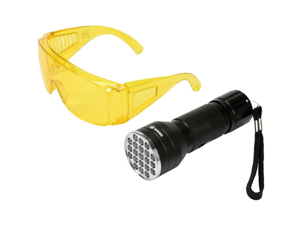 Sada UV lampičky s ochrannými okuliarmi zo žltým filtrom sa používa na zistenie úniku chladiaceho média v klimatizačných systémov vo vozidlách. Balenie obsahuje hliníkovú lampičku s UV svetlom o vlnovej dĺžke 395 nm a okuliare, ktoré chránia zrak pred účinkami UV žiarnia.