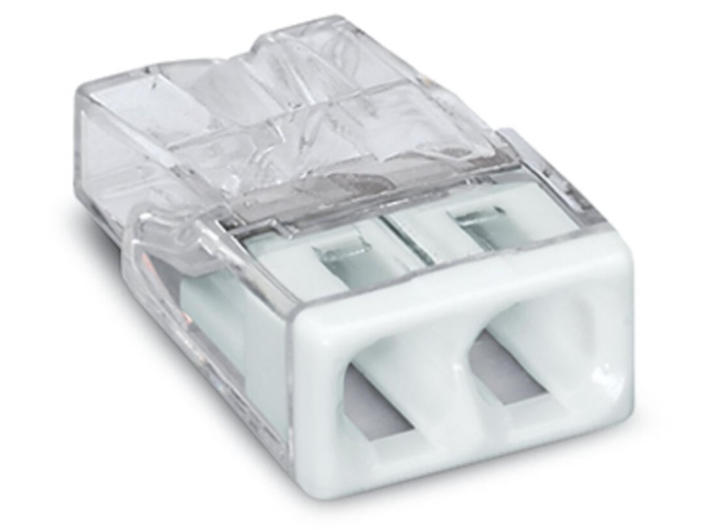 Kompaktná krabicová svorka WAGO 2273-202, 2-pólová pre pevné vodiče. Balenie 100 ks. Prierez 0,5 - 2,5 mm², nominálny prúd 24 A, nominálne napätie 450 V. Do maximálnej teploty prostredia 60°C. Farba: transparentná, biela. Vyrobené v Nemecku.