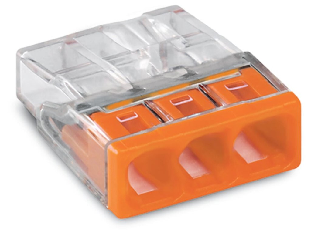 Kompaktná krabicová svorka WAGO 2273-203, 3-pólová pre pevné vodiče. Balenie 100 ks. Prierez 0,5 - 2,5 mm², nominálny prúd 24 A, nominálne napätie 450 V. Do maximálnej teploty prostredia 60°C. Farba: transparentná, oranžová. Vyrobené v Nemecku.